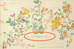 わくわくしながら荷解きをし、目に入った「ウエディングボード」は想像通りの雰囲気に仕上げてぐださっていてとても満足しております。 中島さまがおりなす色彩はとても温かみと優しさが感じられ、私はずーっと眺めていても飽きない感じがします。 同じ絵柄の席札をテーブルにおきますと座られたとき何気なくにっこり皆様が嬉しく思ってくださることと楽しみでもあります。 Thank youカードまで付けてくださり、これから席札に名前を書き加え仕上げるのも楽しみです。本当に有難うございました。 |
